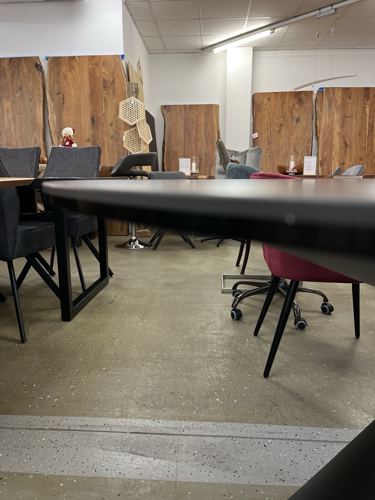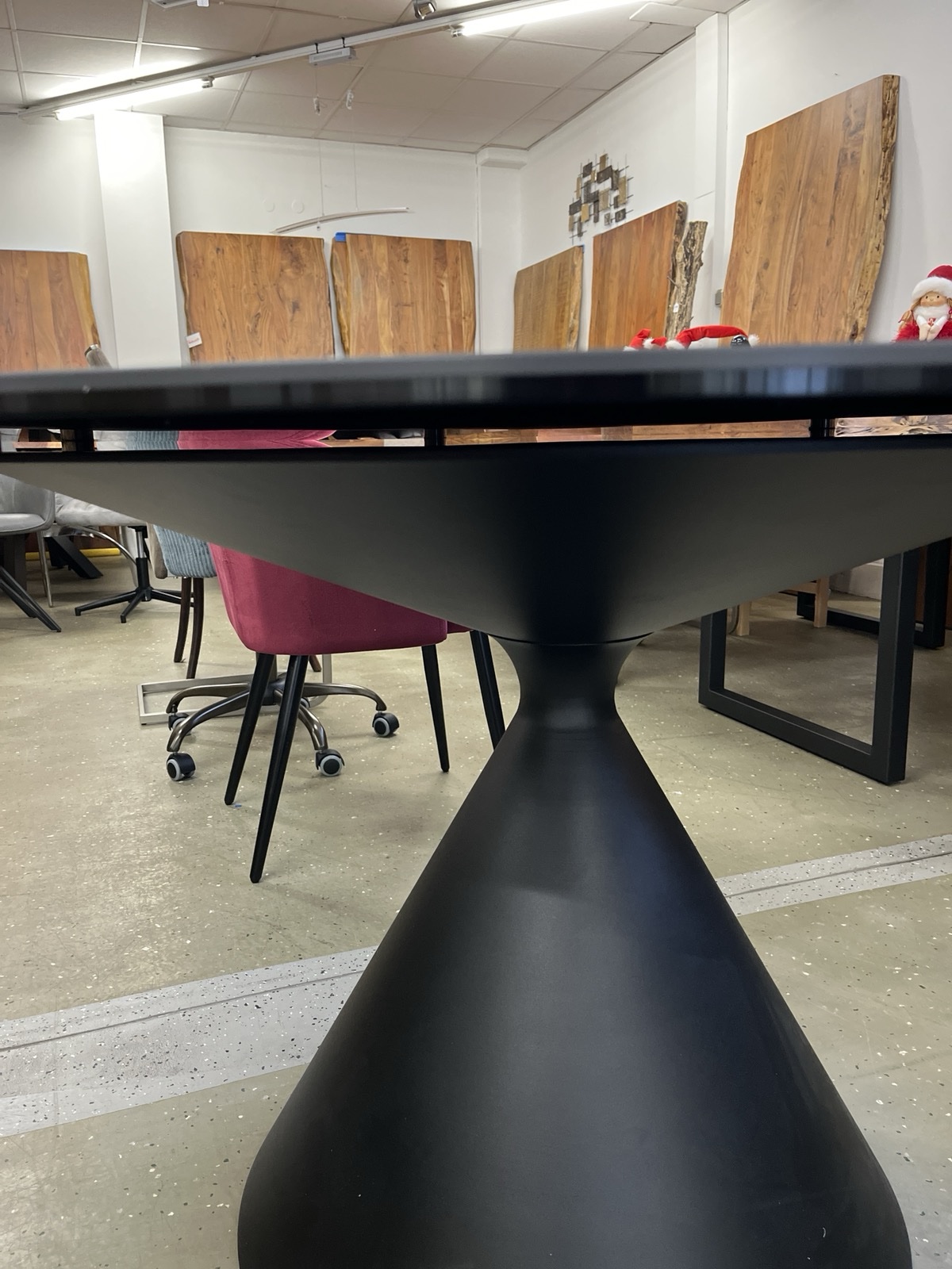 Schwarze gesinterte Steinplatte mit atemberaubendem Maserungsmuster passt perfekt zu einem glatten pulverbeschichteten Sockel